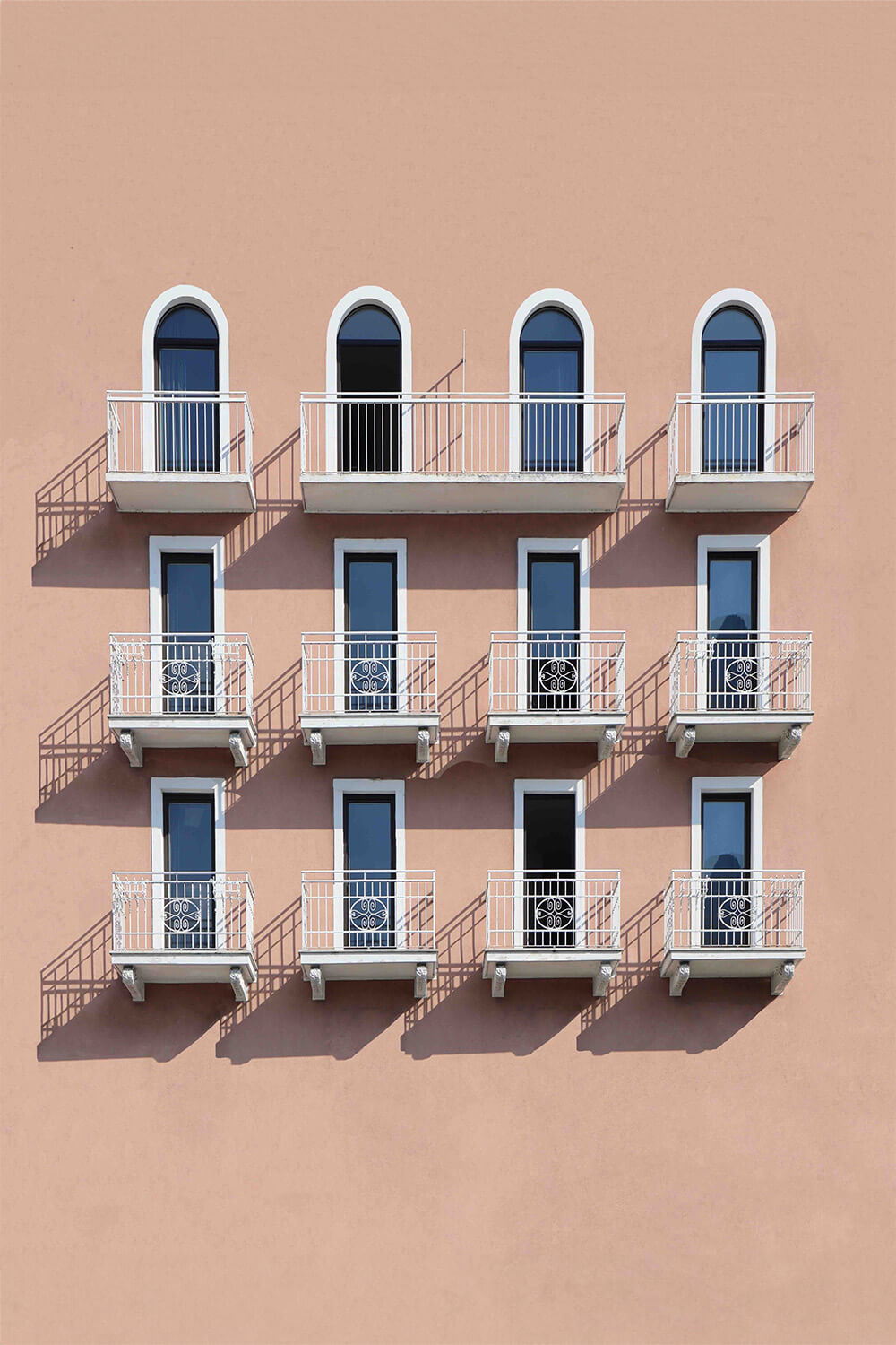 Three rows of windows casting nice shadows on a beige wall. minimalistic