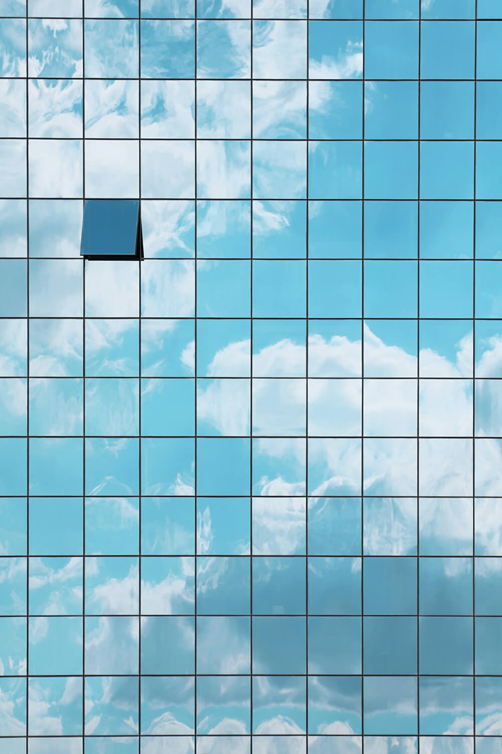 A skyscraper wall with many windows where one single one is open, the wall reflects the sky and clouds. Symmetrical. Minimalistic. Marcus Cederberg