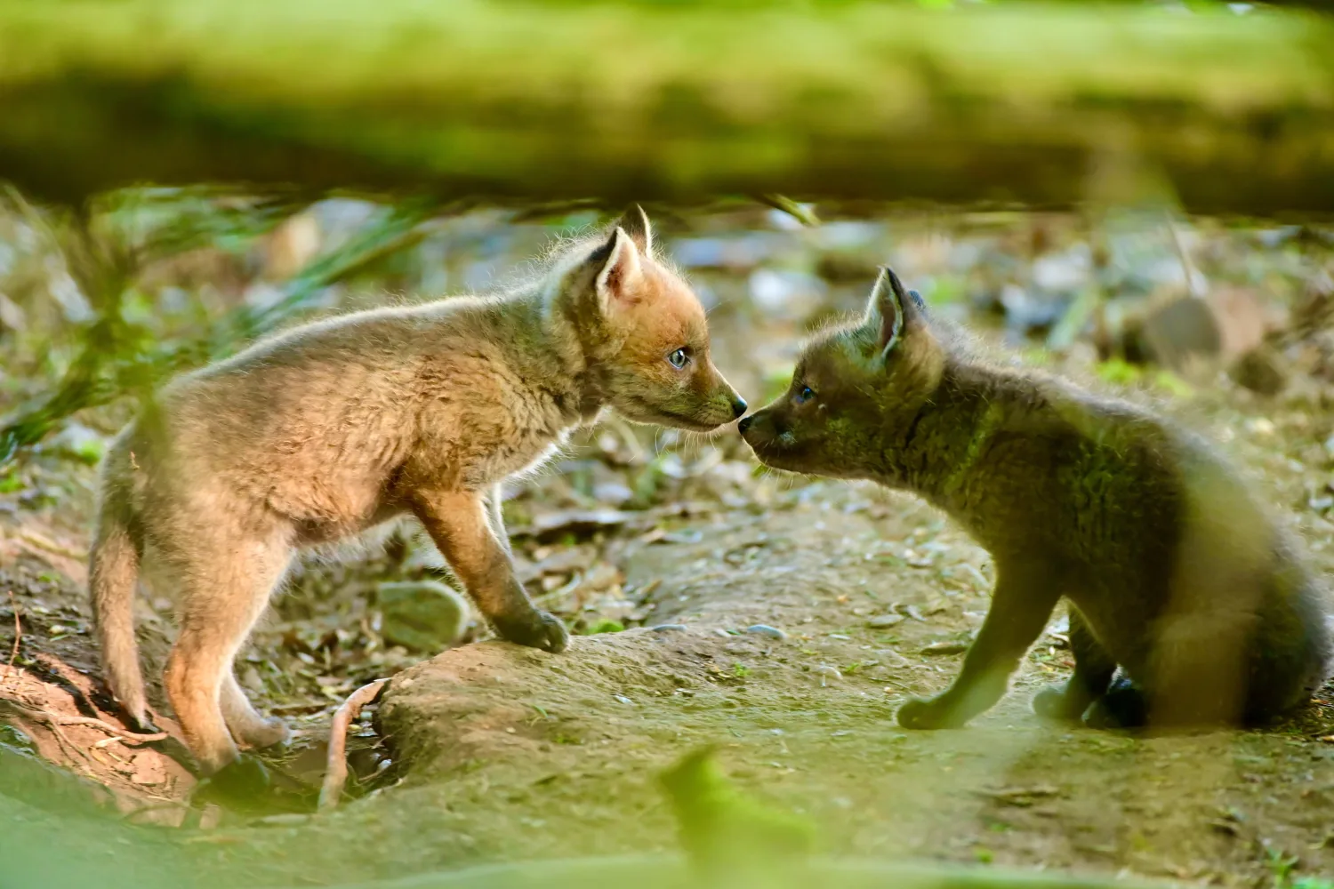This enchanting wildlife photograph captures a tender moment between two young foxes as they curiously sniff each other in their natural forest habitat. The image highlights the playful and inquisitive nature of fox kits, offering a rare glimpse into the intimate life of these elusive animals.